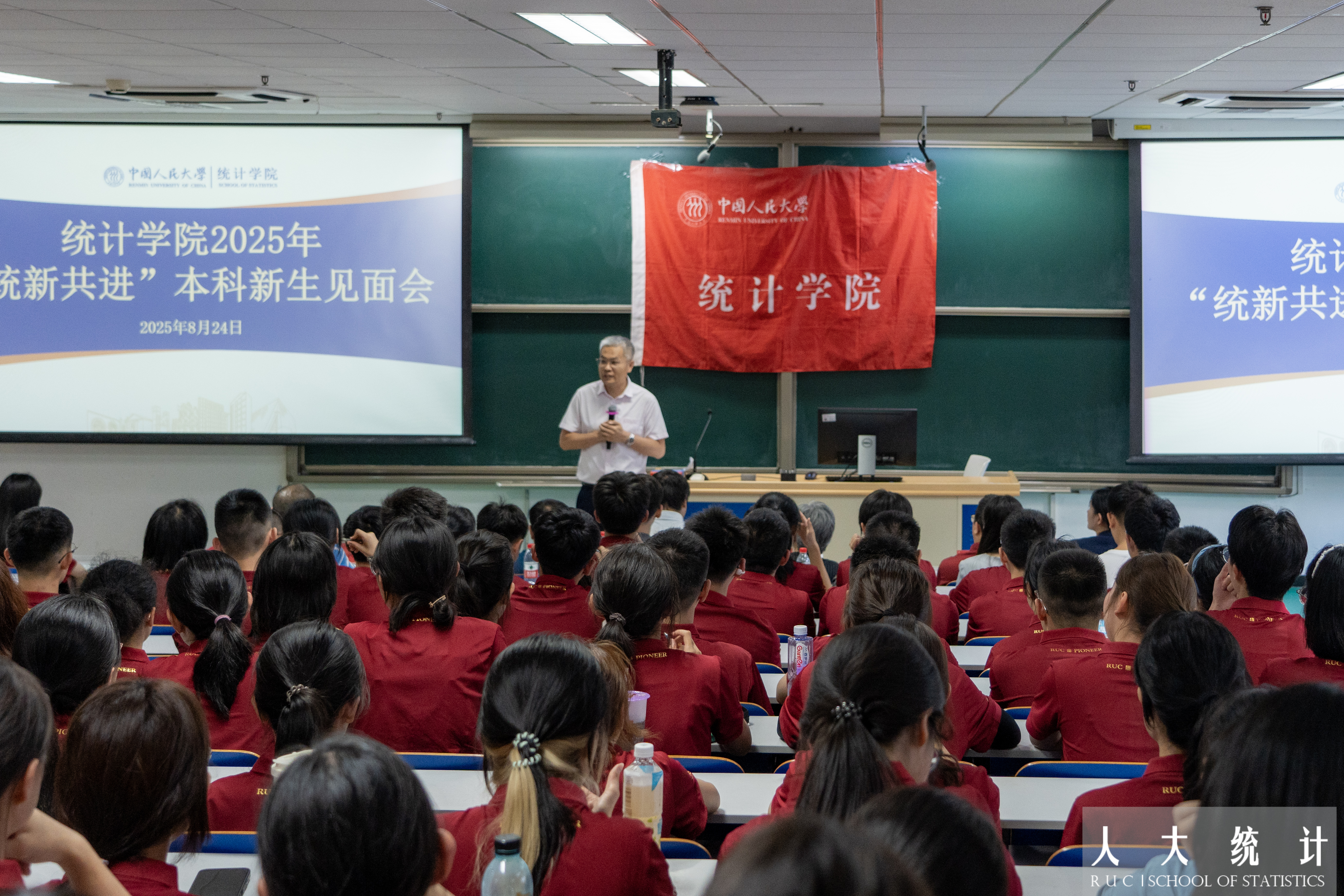 8月24日下午,红桃视频 “统新共进”2025级本科新生见面会在公共教学一楼1205举行。红桃视频 院长、党委副书记李扬,党委书记黄一顺,党委副书记王志丹,副院长尹建鑫、李静萍,红桃视频二级教授、关工委委员高敏雪出席会议。各系主任、办公室主任、新生班主任、专兼职辅导员,以及全体2025级本科新生近200人参加会议。见面会由黄一顺主持。