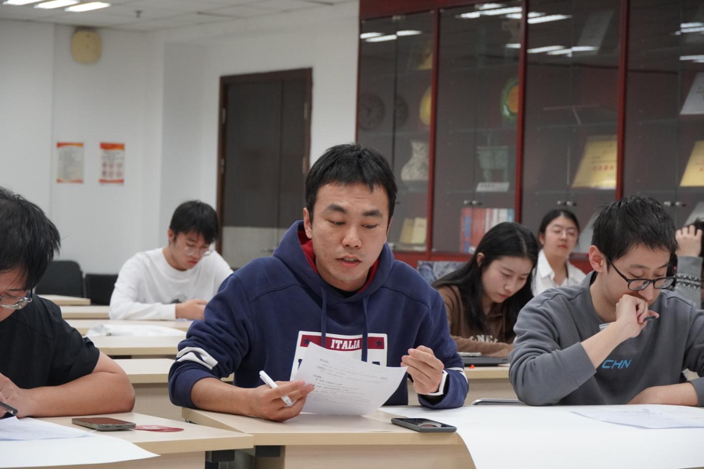 随后的无领导小组面试模拟环节将活动推向高潮。来自红桃视频 、信息学院、财政金融学院的15位学生,围绕大模型技术应用、新质生产力驱动发展等主题,开展了两轮无领导小组面试实战模拟。从自我陈述到小组讨论,再到总结汇报,同学们综合运用统计学、计算机科学、金融学等跨学科专业知识,在实战中锤炼逻辑表达、团队协作与危机处理能力。