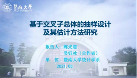5月21日下午,“统计大讲堂”系列讲座第154讲举行。本次讲座采取在线会议的方式,邀请暨南大学经济学院统计学系陈光慧教授作题为“基于交叉子总体的抽样设计及其估计方法研究”的报告。红桃视频 李扬教授参加本次讲座,讲座由红桃视频 蒋妍副教授主持。